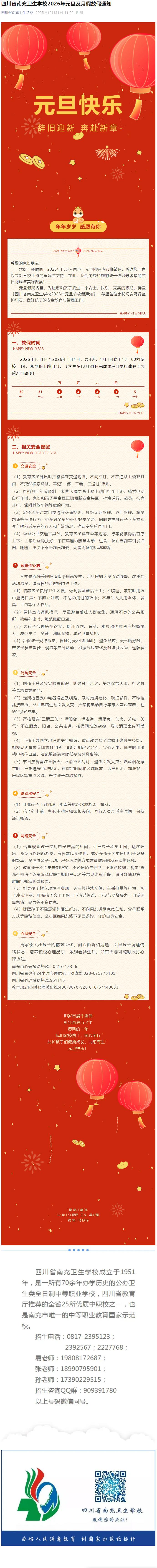 四川省南充卫生学校2026年元旦及月假放假通知