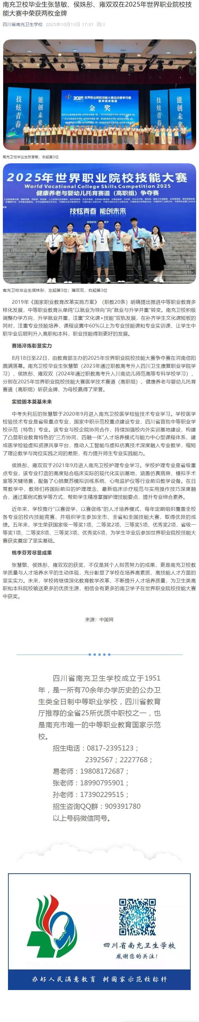 南充卫校毕业生张慧敏、侯姝彤、雍双双在2025年世界职业院校技能大赛中荣获两枚金牌